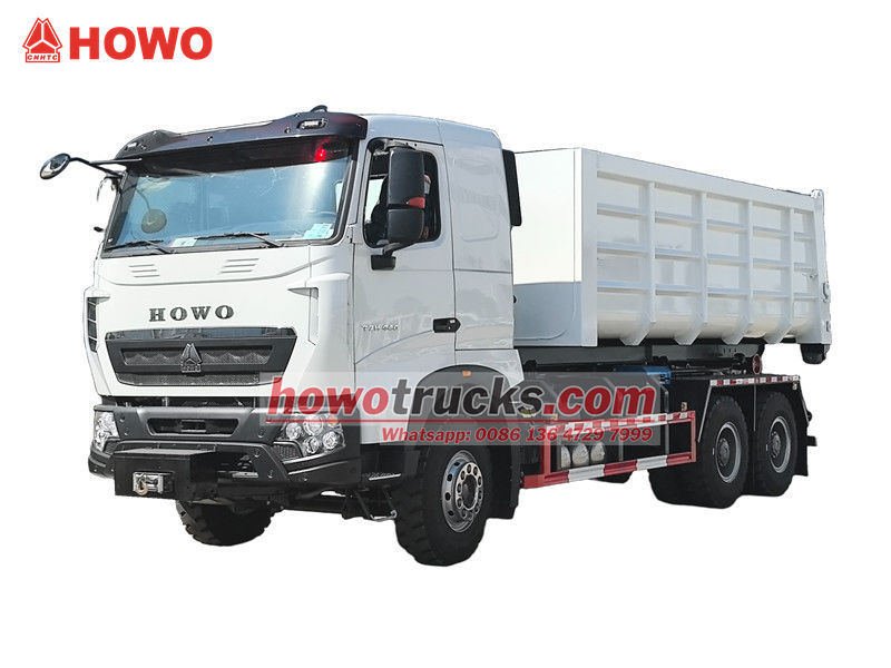 Truk pengangkut kait HOWO 20 ton juga disebut truk sampah lengan kait HOWO 6x4, truk pengangkat kait roro HOWO 10 roda, truk pengangkat kait HOWO, truk sampah kait HOWO 440hp, dll. Kendaraan ini dimodifikasi menggunakan sasis tugas berat HOWO 6x4, dilengkapi dengan mesin diesel MC11.44-50 yang bertenaga dan transmisi HW19710, perpindahan gigi yang kuat dan halus, memastikan kinerja berkendara yang sangat baik dan stabilitas operasional. Kendaraan ini banyak digunakan di berbagai lingkungan kerja seperti jalan perkotaan, kawasan perumahan, pabrik, dan lokasi konstruksi.