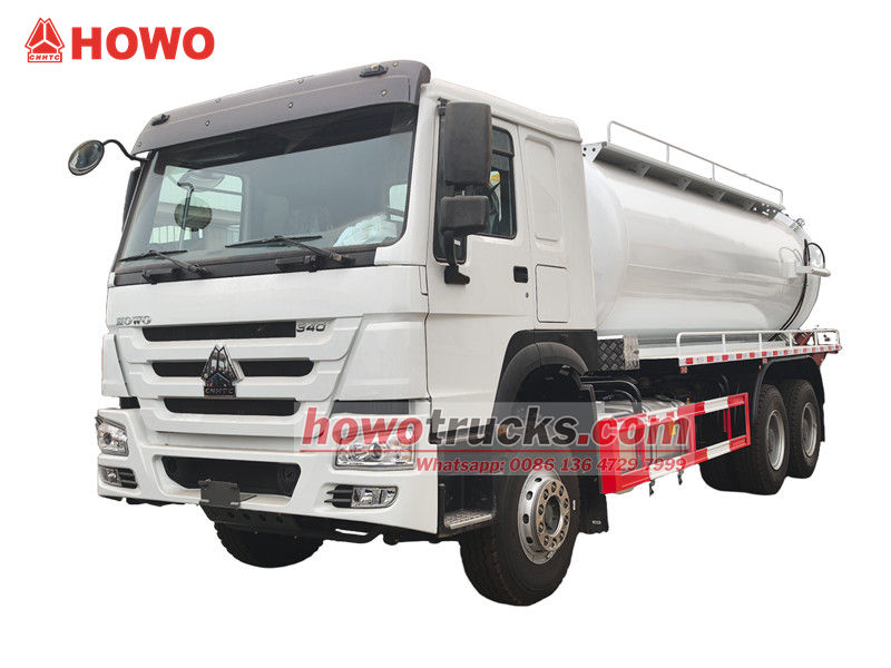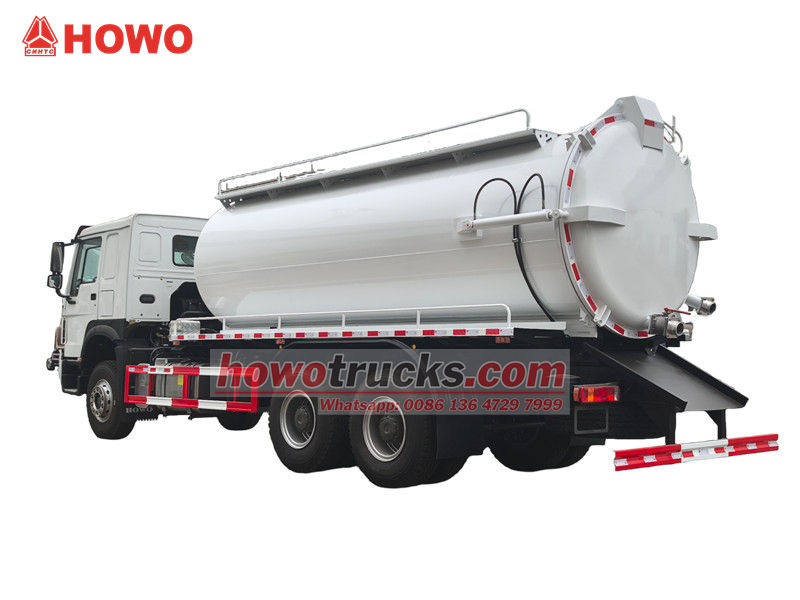 Truk penyedot vakum HOWO 15cbm berbasis pada sasis HOWO 6x4, dilengkapi dengan mesin diesel WP10.340E22 340hp dan gearbox HW19710, yang bertenaga dan mudah dioperasikan. Kendaraan ini dilengkapi dengan tangki vakum 15cbm, yang dapat memenuhi berbagai kebutuhan pengerukan seperti saluran pembuangan perkotaan dan pipa industri.