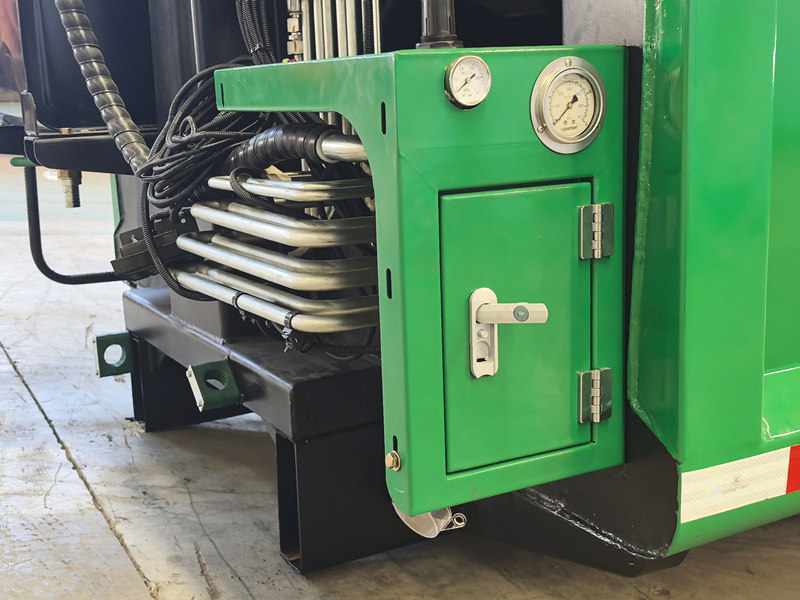 ●Tombol berhenti darurat terletak di bagian belakang bodi, yang menghentikan mesin pemadat dalam keadaan atau posisi apa pun, sehingga menjamin keselamatan operator dan peralatan.