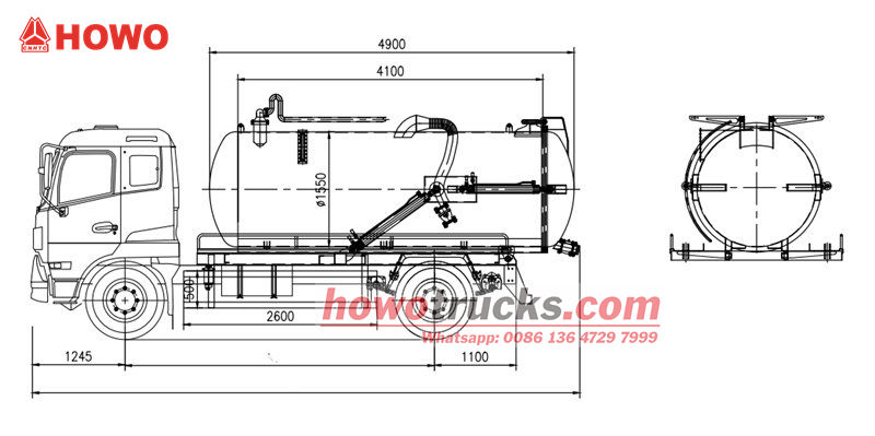 Truk penyedot air limbah Howo 300HP menggunakan sasis Howo 4×2 dengan jarak sumbu roda 4600 mm. Dilengkapi dengan mesin diesel WP10.300E22 300 hp dengan kapasitas 9.726L, dipadukan dengan gearbox HW13710 dan sistem kemudi ZF8198, serta 7 unit ban 295/80R22.5, memberikan tenaga dan stabilitas yang kuat. Bak tangki terbuat dari baja karbon berkualitas tinggi, sehingga kokoh dan tahan lama, serta dilengkapi dengan sistem pompa vakum efisiensi tinggi, yang memiliki fungsi pengisian sendiri, pengurasan sendiri, dan pengosongan sendiri.