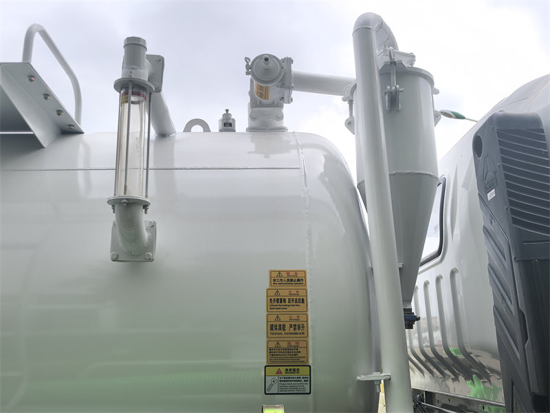 Badan tangki terbuat dari baja berkualitas tinggi Q345 dengan kekuatan tinggi, ketebalan badan dan penutup kepala 6 mm, dengan pelat penyekat di dalamnya, pintu belakang dibuka dan ditutup secara hidraulik; badan tangki dapat diangkat oleh silinder hidraulik.
