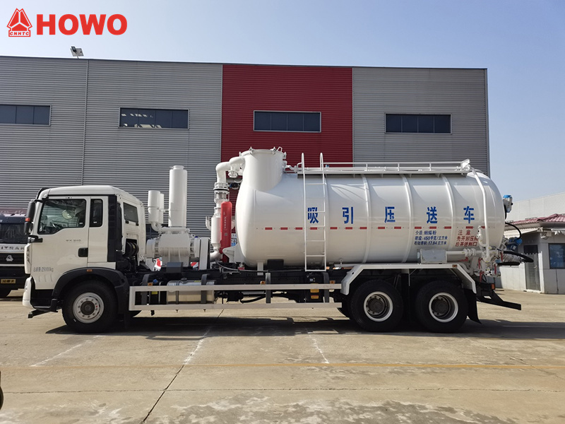 Truk konveyor hisap dan tekan HOWO memiliki dua fungsi utama: hisap tekanan negatif dan pengeluaran tekanan positif.