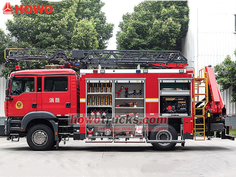 Truk pemadam kebakaran tangga udara Howo adalah kendaraan khusus yang dirancang khusus untuk operasi pemadaman kebakaran dan penyelamatan. Kendaraan ini menggunakan sasis seri Howo TX, memiliki mesin bertenaga 400 HP dan kemampuan manuver yang sangat baik. Truk ini memiliki cat merah terang khas truk pemadam kebakaran dan dilengkapi dengan beberapa kompartemen penyimpanan untuk berbagai peralatan penyelamatan.