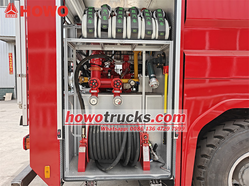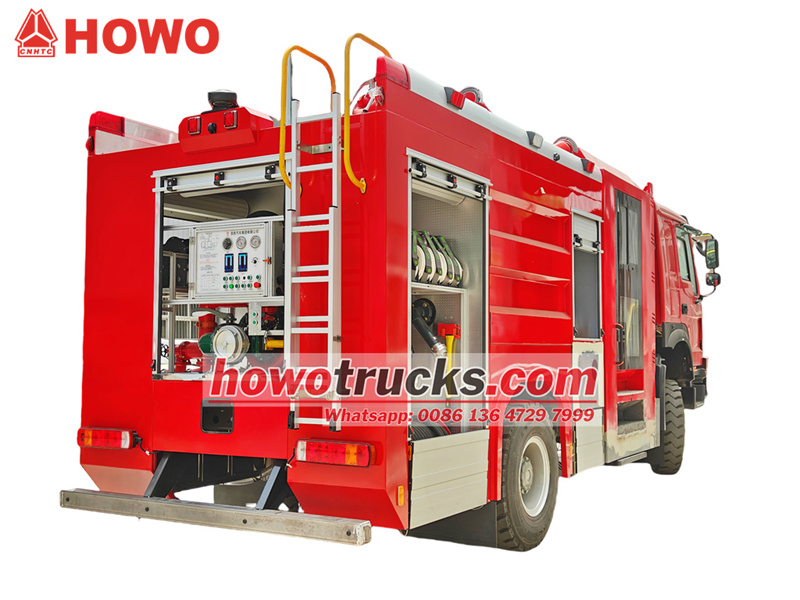 Truk pemadam kebakaran busa HOWO yang dilengkapi dengan bodi tangki terintegrasi, termasuk tangki air 6000L dan tangki busa 2000L.