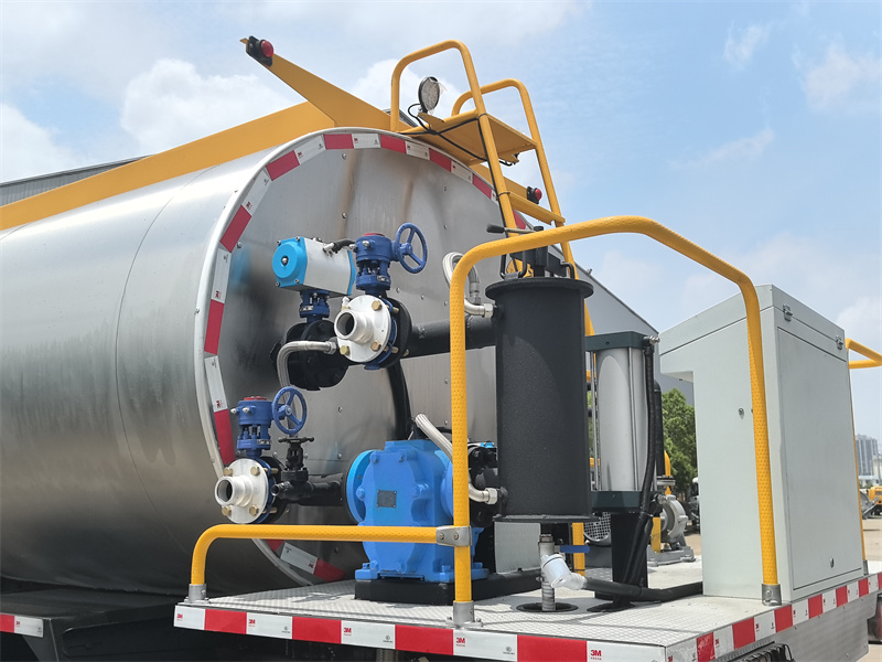 • Kapasitas Tangki: 8 meter kubik. Terbuat dari pelat baja karbon berkualitas tinggi, bagian dalamnya menjalani perawatan anti-korosi profesional (misalnya, penyemprotan cat aspal epoksi) dan bagian luarnya dilapisi dengan bahan isolasi efisiensi tinggi, menghasilkan kinerja isolasi termal yang sangat baik, dengan penurunan suhu aspal sebesar ≤2°C/jam.