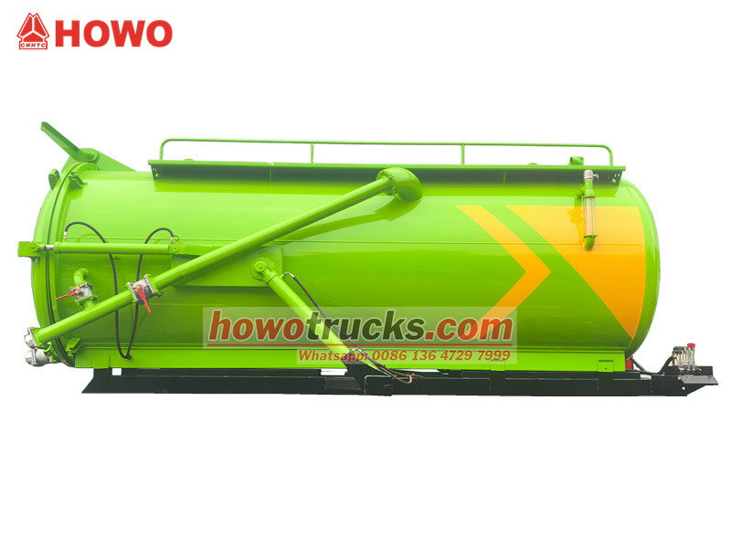 Optional MORO or Jurop pumpBadan tangki penyedot septic tank Howo 8cbm terutama terdiri dari tangki penyedot vakum, pompa vakum, pipa penyedot, kaca pengintai, dan sistem pembuangan. Tangki ini mampu menyedot, menyimpan, mengangkut, dan membuang limbah dan lumpur. Sistem vakumnya memiliki daya hisap yang kuat, secara efisien membersihkan sedimen dari septic tank dan sumur limbah, serta mencegah polusi sekunder.