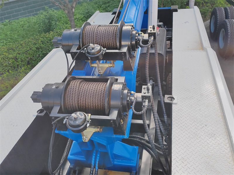 3. Fungsi Derek: Truk derek tugas berat dilengkapi dengan dua winch. Winch ini bekerja bersamaan dengan boom utama dan titik jangkar di lokasi (katrol tetap) untuk melakukan berbagai operasi, seperti meluruskan kendaraan yang terbalik dan menarik kendaraan yang terperosok ke dalam parit yang dalam.