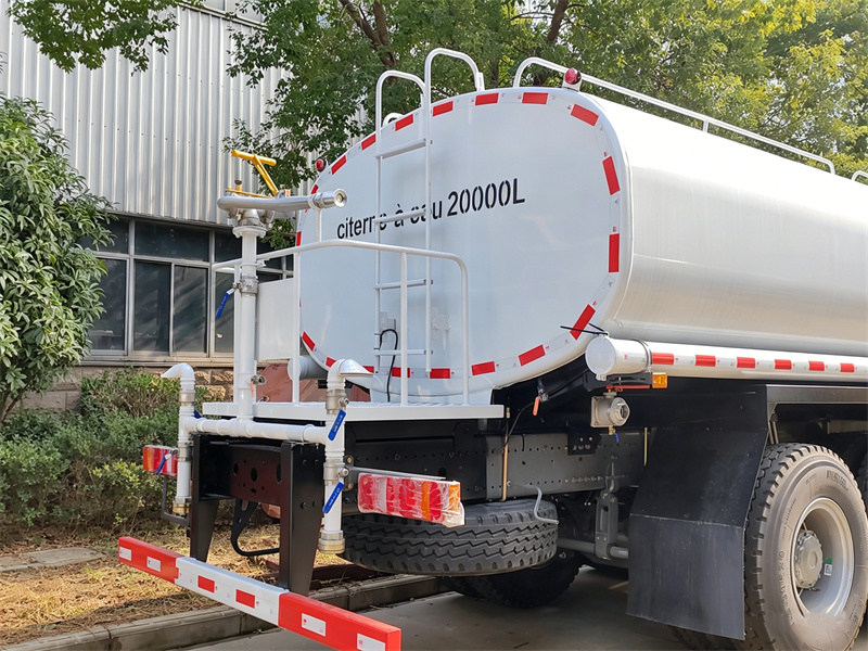 The HOWO 20cbm water sprayer truck, with 4600+1350mm wheelbase, Weichai WD615.47 engine and HW19710 gearbox. The upper includes a 20cbm curved carbon steel water tank, equipped with four devices: front flushing, rear side spraying, rear water sprinkling, and rear water cannon. It is fitted with an 80QZF-60/90 centrifugal water pump, with a flow rate of 60 m³/h and a lift of 90 m. The pump is equipped with inlet and outlet pipelines, a tail discharge valve, a platform ladder, a guardrail, a tank top guardrail, and a manhole.