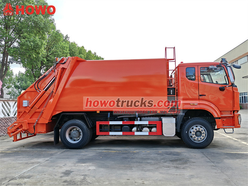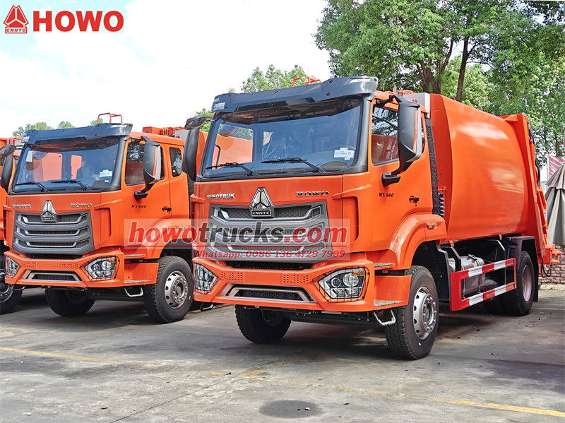 Truk pemadat sampah HOWO 15cbm tipe pemuat belakang siap dikirim ke negara-negara Timur Tengah.