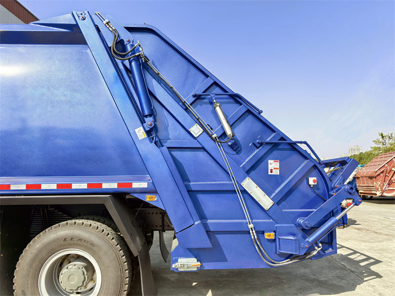 Pengangkat bak sampah pada mesin pemadat sampah HOWO cocok untuk berbagai ukuran bak sampah.