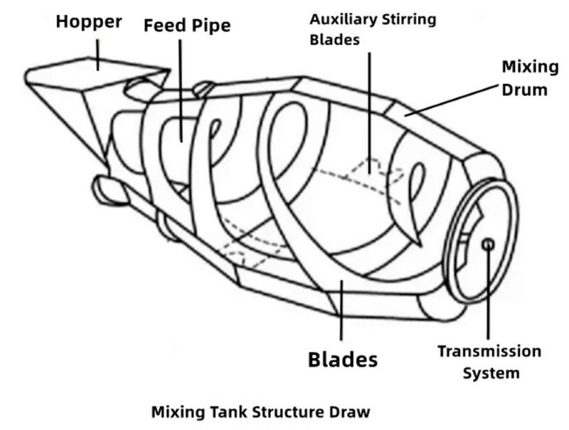 Prinsip kerja inti dari truk pengaduk beton adalah transmisi daya dan pencampuran dalam drum.