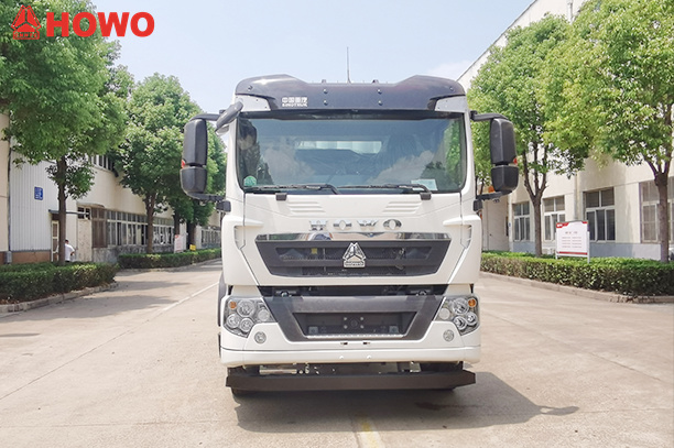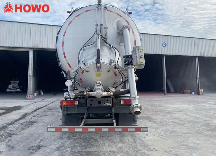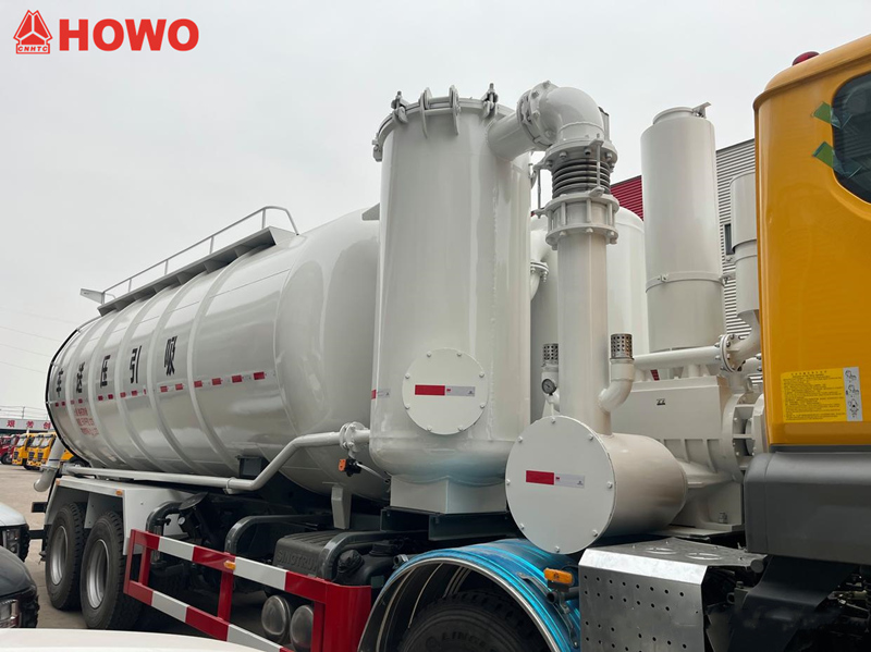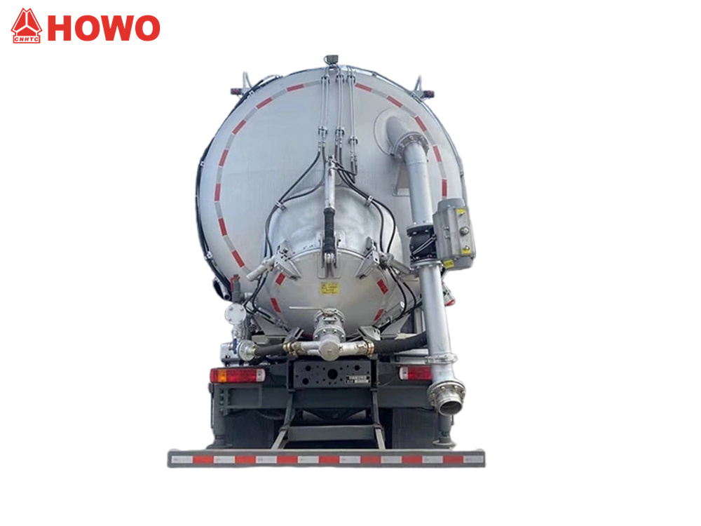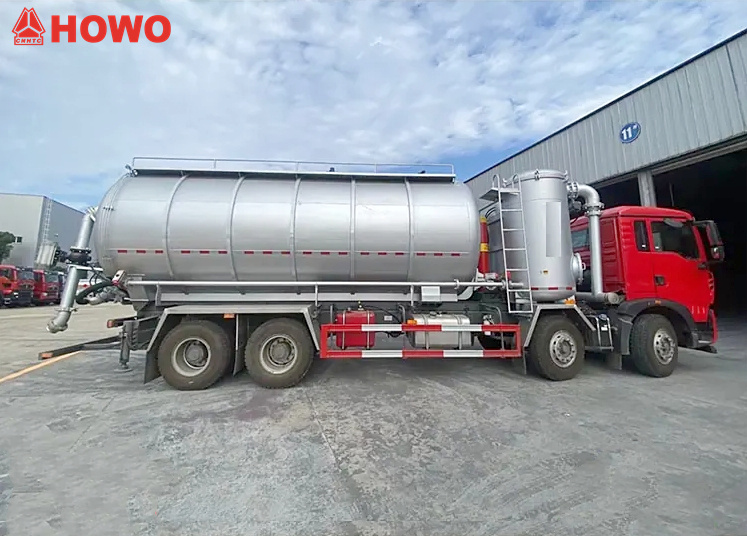 Kendaraan konveyor hisap dan tekan HOWO 8x4 25 cbm, dimodifikasi pada sasis HOWO TX350 8x4, dengan jarak sumbu roda besar 1800+4600+1350mm, dilengkapi dengan mesin Sinotruk MC07H.35-60 dan gearbox HW15710L. Bagian atas bodi dilengkapi sepenuhnya dengan filter kantung, dan bagian belakang berupa tangki penyimpanan. Dilengkapi dengan penstabil hidrolik, kipas, pipa pemasukan sumber udara eksternal, pompa vakum, kompresor udara, silinder pengangkat, sistem filtrasi, sistem perpipaan hisap dan buang, kotak kontrol elektronik, dll. Pompa vakum memiliki hisap tekanan negatif dan kompresor udara memiliki buang tekanan positif.