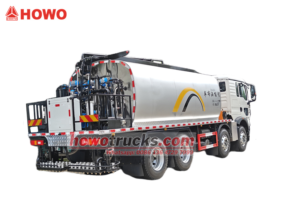Penyebar aspal HOWO 8x4 18 meter kubik dimodifikasi berdasarkan sasis kabin HOWO TX-W 8X4. Memiliki jarak sumbu roda 1800+3800+1350mm, dilengkapi dengan mesin MC07H.35-60, dan gearbox HW13709XSTC2. Bagian atasnya berupa tangki aspal 18 meter kubik yang dapat diisi dengan aspal emulsi dan aspal panas. Dilengkapi dengan pompa oli panas berpendingin udara cerdas RY40-25-160 dan 36 nozzle aspal di bagian belakang. Lebar penyemprotan 6m dan volume penyemprotan 0,2-3 kg/m².²Selain itu, alat ini juga memiliki pembakar diesel impor (nilai kalor: 10×10).⁴kkal/jam), pemanas oli termal otomatis, dan kontrol komputer cerdas di dalam kabin (Siemens, Jerman).