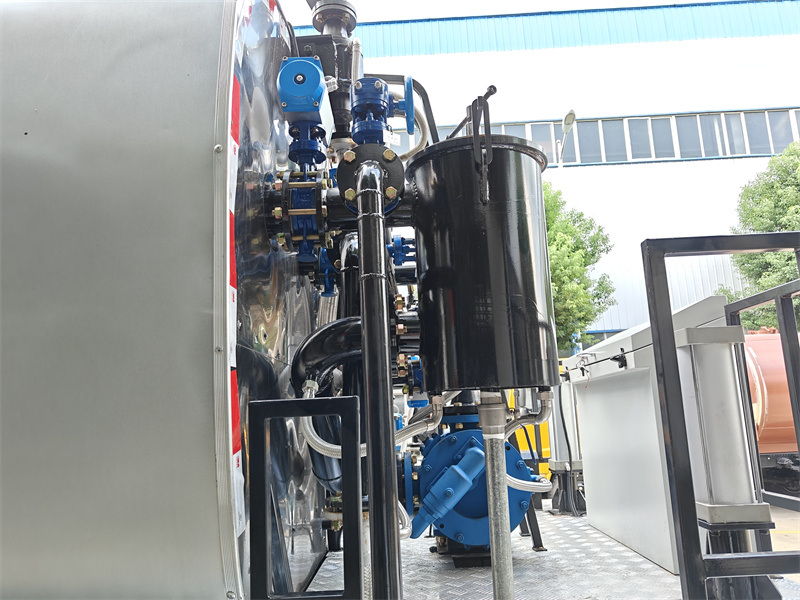 2.Tangki Besar: Tangki aspal berkapasitas 18 meter kubik ini kompatibel dengan aspal emulsi dan aspal panas, serta memberikan insulasi termal dan daya tahan.